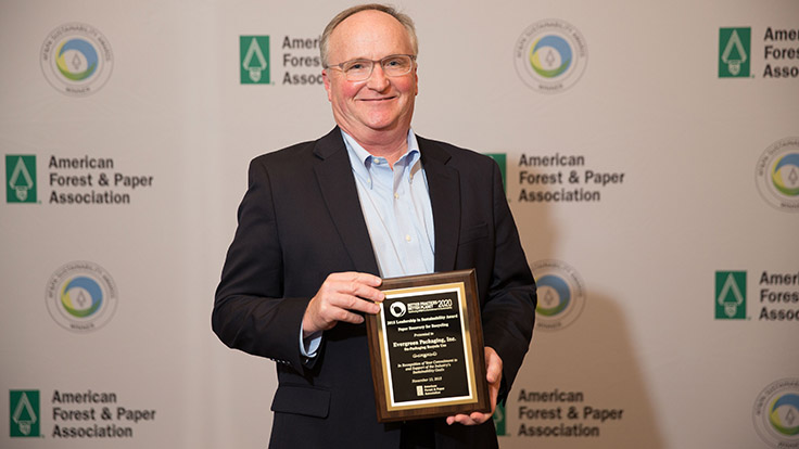 Pictured above: Derric Brown, director of sustainability for Evergreen Packaging, accepts the AF&PA Sustainabillity Award for Paper Recovery for Recycling.